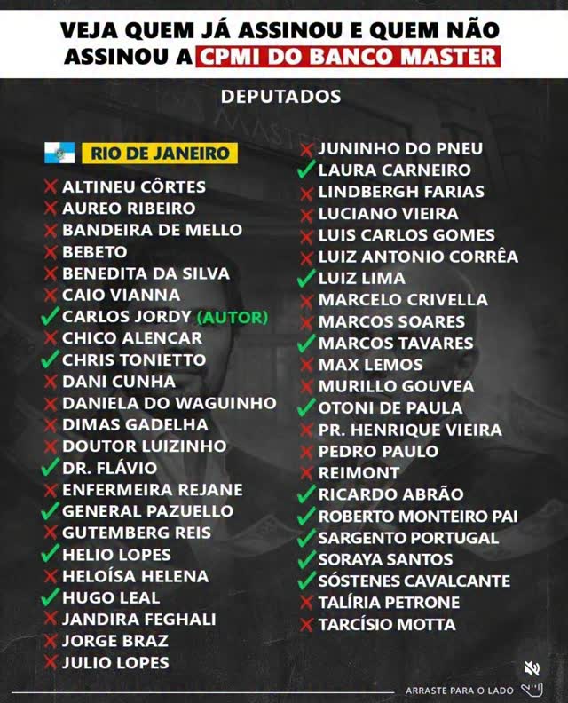 Apenas 15 dos 46 deputados federais do Rio de Janeiro assinaram a CPMI para investigar o BANCO MASTER. O que houve? O Estado aplicou bilhões de reais, vai tomar calote, é precisa saber quem são os responsáveis. Foram R$ 970 MILHÕES DO RIOPREVIDÊNCIA e mais R$ 250 MILHÕES DA CEDAE? Na Assembléia abrir uma CPI é quase impossível,mas porque os deputados federais estão com medo? Tem gente na lista que faz oposição a CLÁUDIO CASTRO, o maior responsável, então porque não assinar?