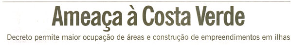 A reportagem fala que “sem fazer alarde”, o governador Sérgio Cabral publicou um decreto, que libera construções de mansões e de hotéis, em 70 ilhas e 81 quilômetros da faixa litorânea, que ficam dentro da Zona de Conservação da Vida Silvestre, na baía da Ilha Grande.