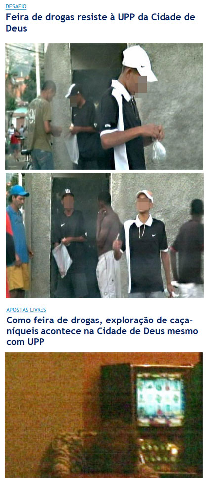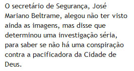 Outra matéria mostra também o livre funcionamento de máquinas de caça-níqueis nos bares e biroscas da Cidade de Deus, na cara dos policiais. Mas diante das provas contundentes de que essa história de pacificação não passa de uma farsa, de uma montagem, de um acordo com bandidos, qual não foi minha surpresa ao ver a reação patética, deplorável do secretário de Segurança Pública, José Mariano Beltrame. Vejam com seus próprios olhos.
