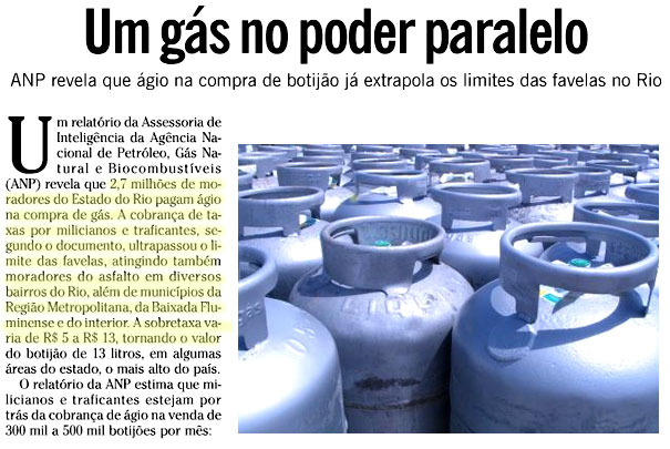 Segundo a ANP, cerca de 2,7 milhões de moradores fluminenses pagam ágio no botijão de gás, seja a milicianos ou a traficantes. Essa é a dura realidade. O jornal Extra mostra hoje, mesmo sem nenhum destaque, que taxistas que fazem ponto no Centro do Rio estão apavorados porque surgiu uma milícia chefiada por policial militar aposentado que quer “cobrar taxa de proteção” para poderem estacionar. Até na Zona Sul e na Tijuca já há trechos onde os moradores são obrigados a pagar “taxa de proteção” a milicianos.