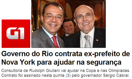 Deve ter tomado o mesmo rumo de ex-prefeito de Nova Iorque, Rudolph Giuliani, que criou o programa Tolerância Zero baixando os índices de criminalidade da Big Apple (é como os americanos chamam Nova Iorque). Em dezembro do ano passado, Cabral anunciou a contratação de Giuliani para assessorar o governo na área de segurança pública. O site G1 (Organizações Globo) chegou a noticiar (vejam abaixo), que o contrato foi assinado, o que é uma grande mentira. Cadê Giuliani? Também foi esquecido? Já faz 11 meses...