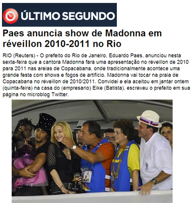 Ah! Só para citar mais um caso, esse misturando Cabral com seu “pupilo” Eduardo Paes. O prefeito com Cabral ao lado, naquele célebre e triste papelão feito pelo governador, completamente embriagado no Sambódromo, confirmou que estava tudo certo e Madonna seria a grande atração do próximo reveillon em Copacabana. Chegou a dizer: “O reveillon com Madonna, como prefeito, posso garantir que está certo”. Bem, não sei onde Madonna estará no reveillon. Só sei que não vai se apresentar no reveillon do Rio.