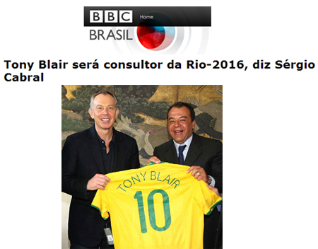 Mas não pensem que Tony Blair desembarca no Rio para se encontrar com Cabral e assumir o posto de consultor. Vai a São Paulo dar uma palestra a empresários que pagaram e não foi pouco por um lugar na platéia. Uma coluna publicou que Cabral e Paes vão assistir à palestra. Não sei se informação procede. Mas e a consultoria de Tony Blair às Olimpíadas do Rio de 2016 foi esquecida? Nunca mais ninguém falou nisso e lá se vão 10 meses...