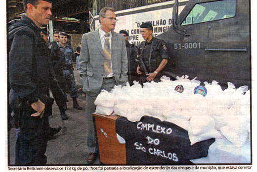 A foto acima foi publicada na quinta-feira (15/05) pelo jornal MEIA-HORA e ilustrava a matéria sobre o que seria a maior apreensão de drogas realizada no governo Sérgio Cabral. O secretário de Segurança Pública, José Mariano Beltrame, fez questão de posar diante dos 173 quilos de pó apreendidos pelo BOPE no morro de São Carlos.