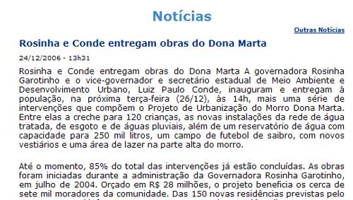 Pra começar as 24 casas que Cabral entregou hoje fazem parte do projeto de Rosinha. Pra quem tem dúvidas veja abaixo a matéria publicada, no dia 24 de dezembro de 2006.