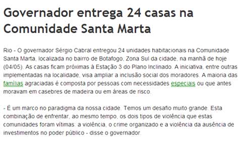 O governador afirma que a entrega de 24 casas no Morro Dona Marta “é um marco” e que nunca houve investimentos públicos na comunidade. Mentira das grandes.